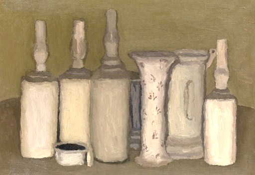 Os objectos do quotidiano parecem respirar uma metafisica suave, evanescente, que condiz com a vida de solidão ascética do pintor.