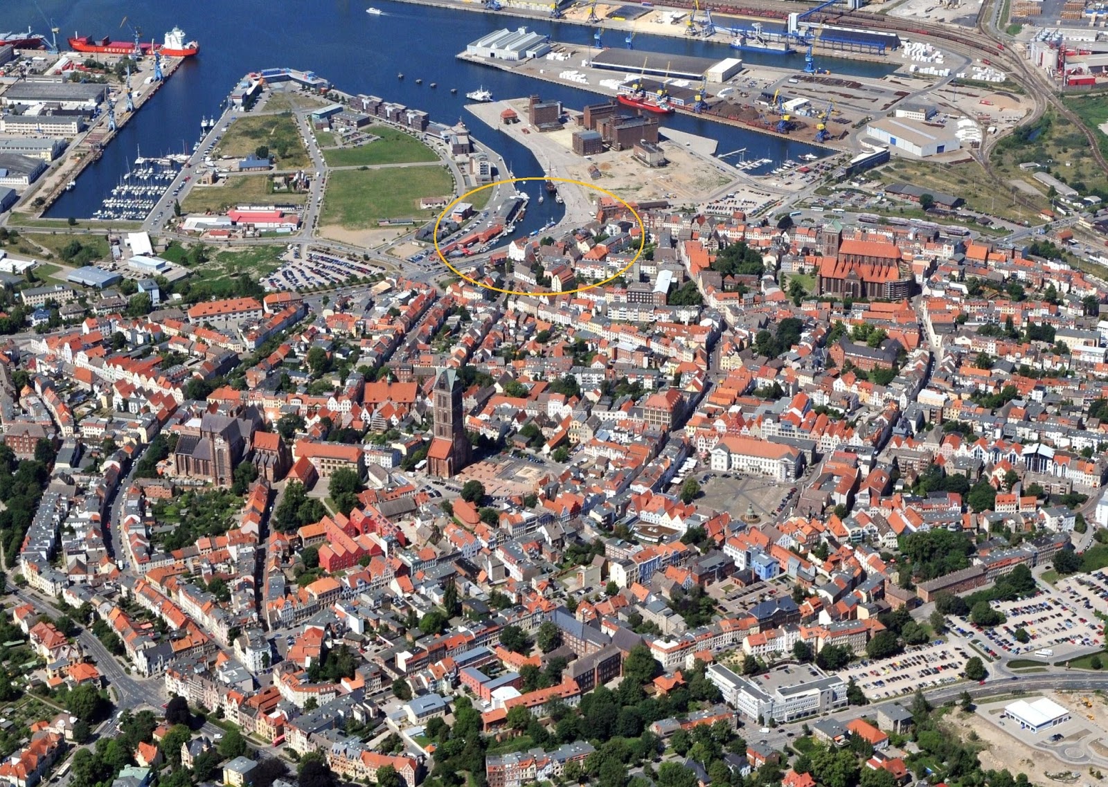 Nestas duas fotos aéreas, assinalei a zona do porto hanseático.