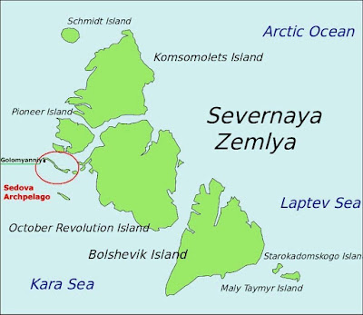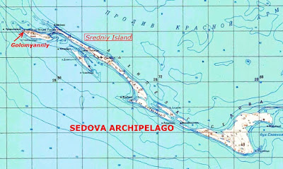 Um grupo de ilhas pequenas a Oeste constitui o Arquipélago Sedov. Duas das mais pequena ilhas, espantosamente, são 'habitadas' de certa forma: a ilha Sredniy tem uma pista de aterragem militar, e, vejam lá, um Museu ! - e a minúscula ilha Golomyanniy acolhe (se a palavra não faz rir) uma estação meteorológica desde 1954, parte da famosa rede de estações construída no fim do czarismo e depois grandemente desenvolvida pelo estado soviético.