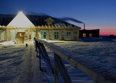 Parece uma 'dacha', mas a 80º N.Pelo menos uma família tem de viver aqui para fazer todo o trabalho - recolha de dados, previsões, estudos estatísticos, comunicações, manutenção, e fazer os possíveis para que a vida seja suportável.