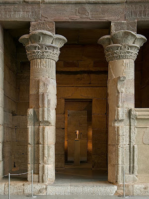 As duas colunas que simbolizam o Sul (Alto Egipto) e Norte (Baixo Egipto). Não é um faraó, é o Imperador Augusto a fazer uma oferta aos deuses Isis e Osiris, a quem o templo é dedicado.