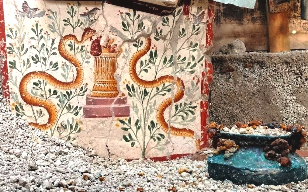 Ao lado há uma janela que abre para um pequeno pátio com um altar (lararium) decorado com plantas e animais.